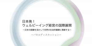 | 15:15-15:45 | ウェルビーイングISOガイドライン 国際標準(ISO)で定められた「ウェルビーイングISOガイドライン」とはどのようなものか?取組内容とビジネス的な狙いなどを紹介します。 | (一社)社会的健康戦略研究所 |